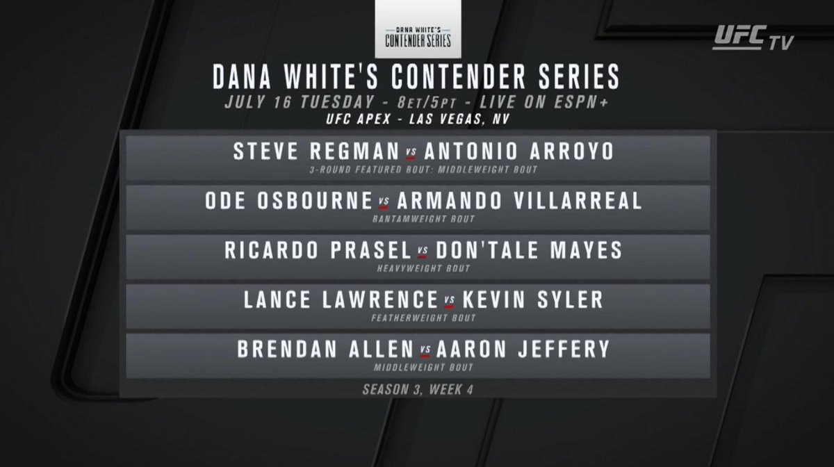 De UFC heeft de line-up voor de vierde week van het derde seizoen van de Dana White’s Tuesday Night Contender Series bekend gemaakt. Op Social Media waren al meerdere gevechten uitgelekt. Net als vorig jaar zullen vechters gaan strijden om een UFC contract. De show bevat elke dinsdagnacht op woensdagochtend (02.00u Nederlandse tijd op UFC FightPass) in totaal vijf gevechten. De vechters nemen het tegen elkaar op onder toezien van Dana White, Sean Shelby en Mick Maynard. De gevechten duren driemaal vijf minuten en tellen mee voor het Professionele MMA record. De Nevada State Athletic Commission gaf hier wederom een licentie voor. De show loopt van 18 Juni tot en met 27 Augustus.