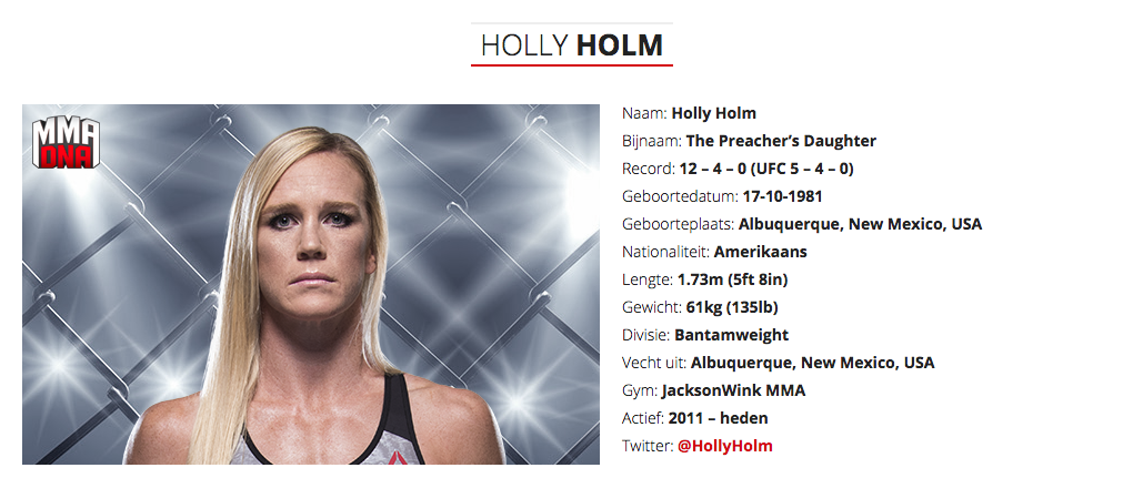 De 36-jarige Holm heeft ook gevochten tegen de Nederlandse Germaine de Randamie. Ze verloor dit met unanieme beslissing tijdens UFC UFC 208 in Brooklyn, New York. Door dit verlies ging het goud haar voorbij.