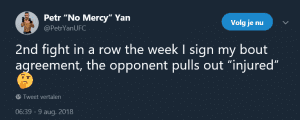 Vanmorgen maakte de Russische Bantamweight vechter Petr Yan bekend via Twitter dat hij zonder tegenstander zit voor UFC Fight Night 136 in Moskou. De Braziliaan Douglas Silva de Andrade is geblesseerd geraakt en heeft zich hierdoor moeten afmelden. De UFC is nu op zoek naar een Bantamweight vechter die het op 15 September 2018 in Moskou tegen Yan kan opnemen.