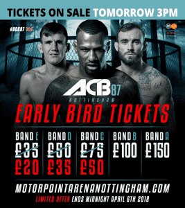 Nadat eerder deze week al het Main Event en Co-Main Event werden aangekondigd voor ACB 87 in Nottingham heeft de Russische organisatie wederom een sterke partij toegevoegd aan de line-up. De Engelsman Pietro Menga zal zijn debuut maken voor de organisatie in de Bantamweight divisie tegen UFC veteraan Takeya Mizugaki. Beide vechters treffen elkaar op 19 Mei 2018 in de Motorpoint Arena in Nottingham, Engeland.