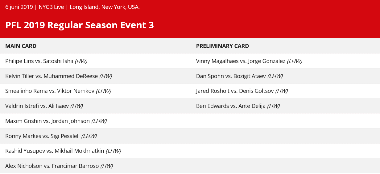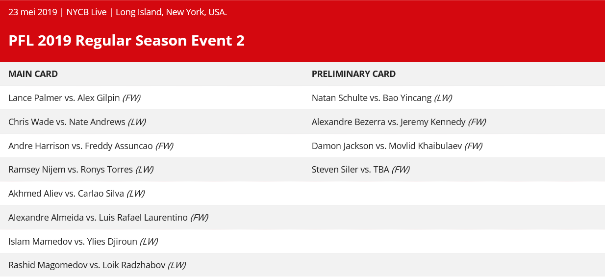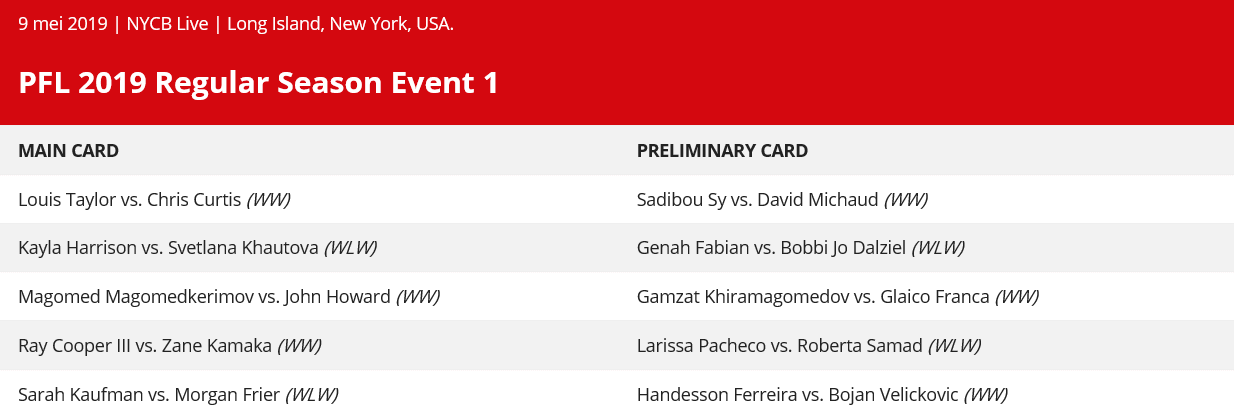 De afgelopen maanden heeft de ProFightLeague de schema’s en vechters bekend gemaakt die meedoen aan het seizoen 2019 van de PFL MMA competitie. Zo zullen vier Kampioenen terugkeren. Middleweight Kampioen Louis Taylor stapt over naar de Welterweight divisie omdat PFL geen Middleweight toernooi zal houden dit jaar. PFL heeft daarvoor in de plaats een Lightweight divisie voor vrouwen ingevoerd. In Nederland is de PFL gratis te volgen via Facebook.