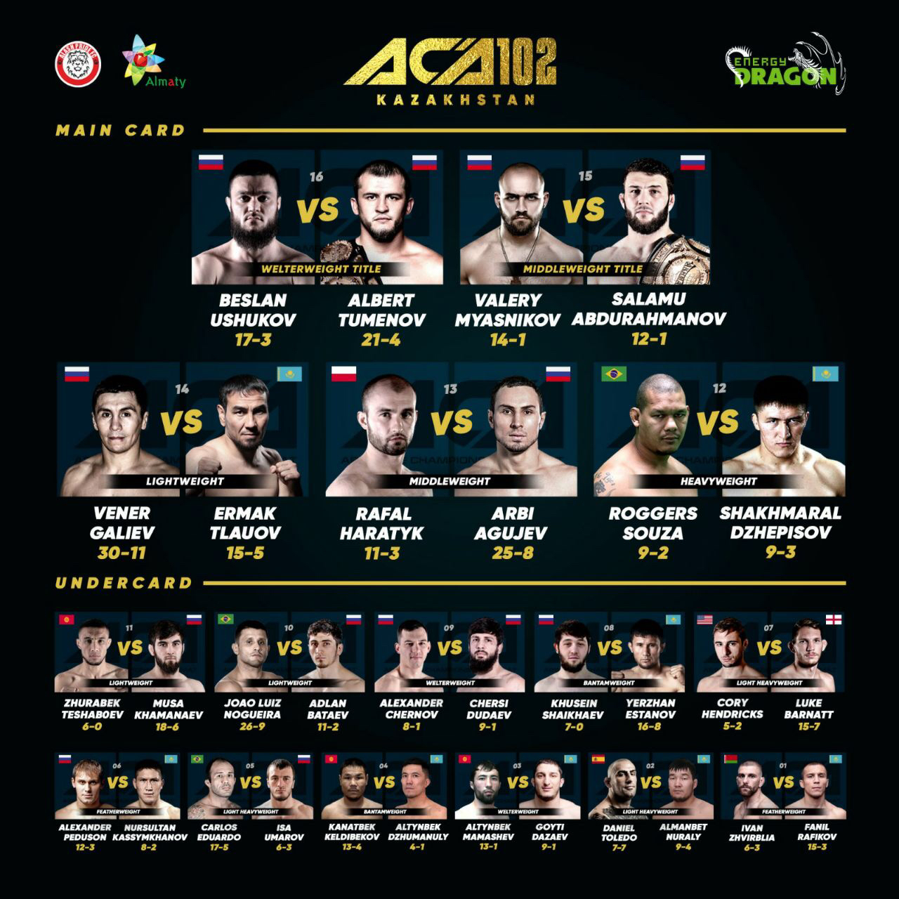 Zojuist vond in de Almaty Arena te Almaty, Kazachstan het 102de evenement plaats van de ACA organisatie. Tijdens het Main Event zette Welterweight Kampioen Albert Tumenov zijn titel op het spel tegen Beslan Ushukov. Eveneens nam tijdens het Co-Main Event Middleweight Kampioen Salamu Abdurakhmanov het op tegen Valery Myasnikov. Tot slot maakte ook Vener Galiev zijn promotionele debuut tegen lokale held Ermek Tlauov.