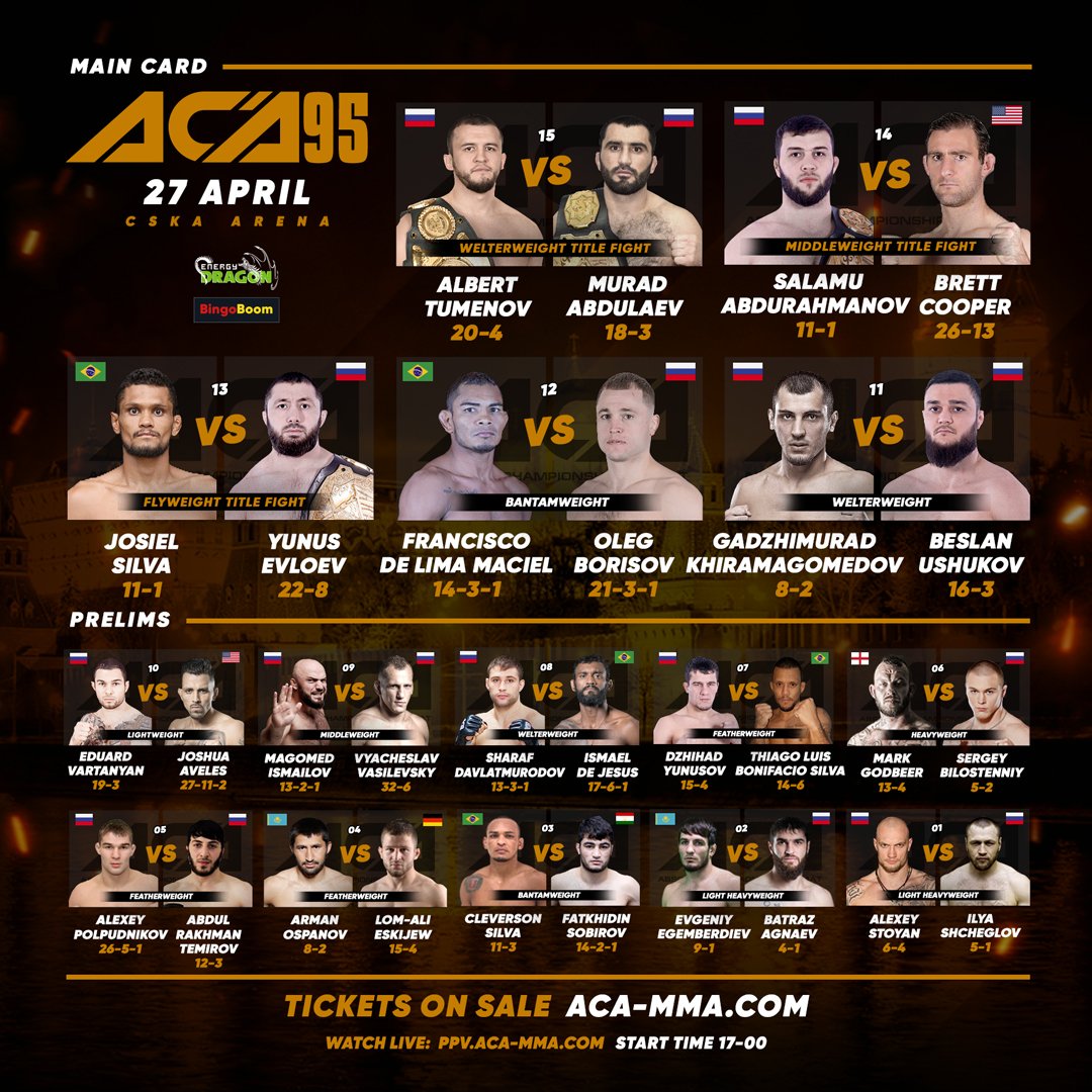 Zojuist vond in de CSKA Arena te Moskou, Rusland het 95ste evenement van de ACA organisatie plaats. In totaal stonden er liefst drie titels op het spel. Tijdens het Main Event nam ACB Welterweight Kampioen Albert Tumenov het op tegen WFCA Welterweight Kampioen Murad Abdulaev. Eveneens stonden ook de Flyweight en Middleweight titel op het programma.