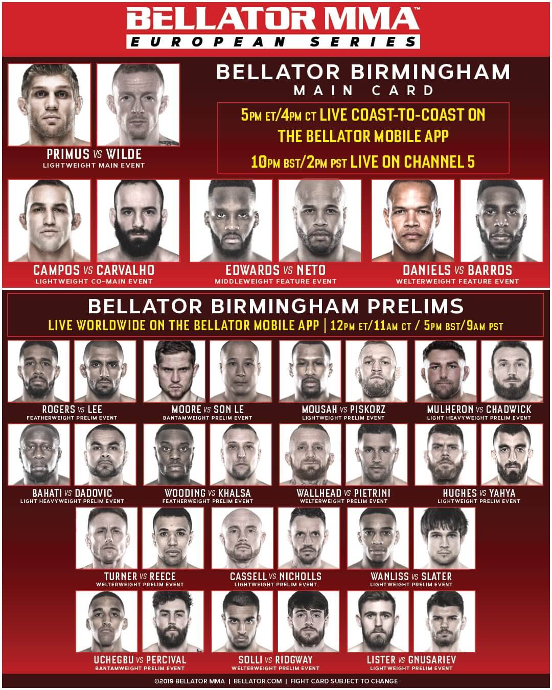 Zojuist vond in de Resorts World Arena te Birmingham, Engeland het tweede evenement van de Europese Series van Bellator MMA plaats. Tijdens het Main Event nam voormalig Lightweight Kampioen Brent Primus het op tegen Tim Wilde. Eveneens stond tijdens het Co-Main Event een partij op het programma tussen Derek Campos en Pedro Carvalho.