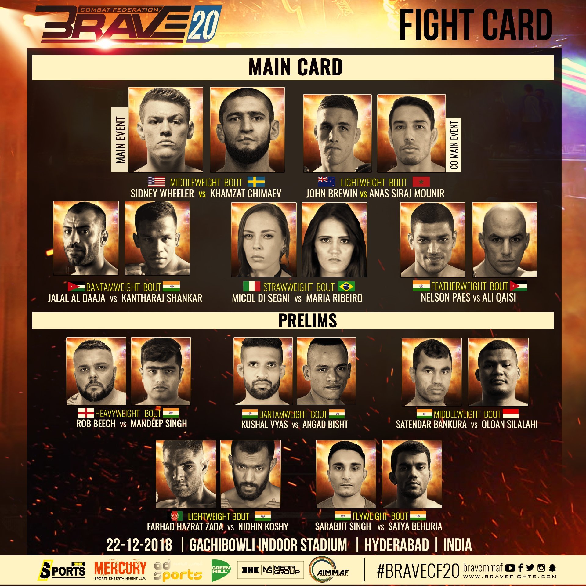 Zojuist vond in het Gachibowli Indoor Stadium te Hyderabad, India het 20ste evenement van de Brave Combat Federation plaats. Tijdens het Main Event nam Sidney Wheeler het op tegen Khamzat Chimaev. Chimaev pakte het gevecht een week van te voren aan nadat Leon Aliu in verband met een blessure moest afzeggen. Eveneens stond tijdens het Co-Main Event een partij op het programma tussen de ongeslagen John Brewin en Anas Siraj Mounir.