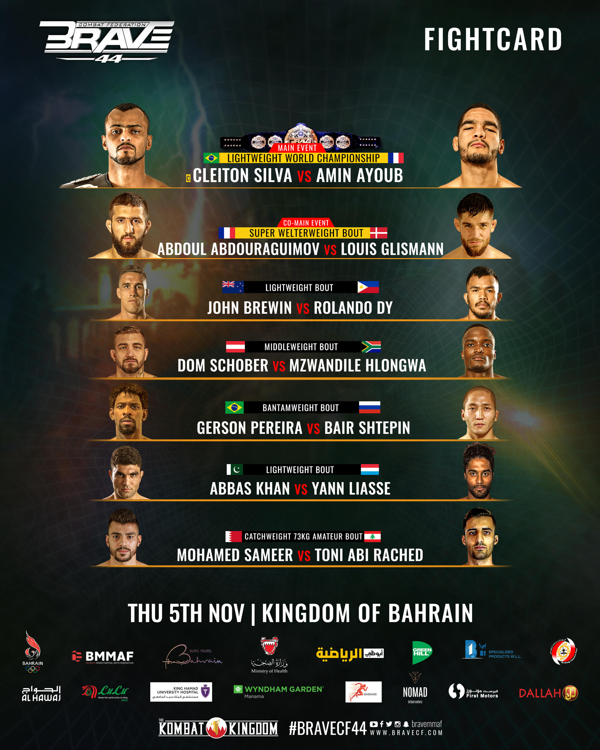 Zojuist vond in Bahrein het 44ste evenement plaats van de Brave CF organisatie. Tijdens het Main Event zette Lightweight kampioen Cleiton Silva zijn titel op het spel tegen de Fransman Amin Ayoub. Eveneens nam voormalig Welterweight kampioen Abdoul Abdouraguimov het op tegen Louis Glismann tijdens het Co-Main Event.