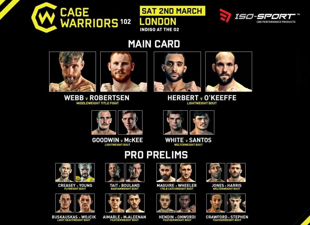 Zojuist vond in het Indigo @ the O2 te Londen, Engeland het 102de evenement plaats van de Cage Warriors organisatie. Tijdens het Main Event namen Thomas Robertsen en James Webb het op voor de Middleweight titel. Eveneens maakte ook Jai Herbert zijn opwachting tegen Steve O’Keeffe. Tot slot maakte ook Red Kings MMA vechter Brian Bouland zijn terugkeer bij de Cage Warriors organisatie. De Belg nam het op tegen Cory Tait.