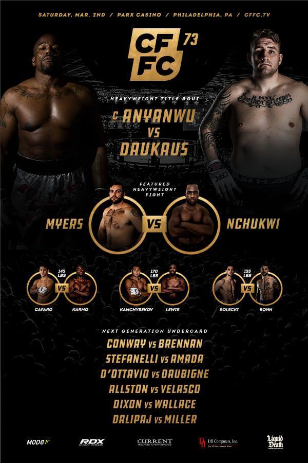 Zojuist vond in het Parx Casino te Philadelphia, Pennsylvania het 73ste evenement van de CFFC organisatie plaats. Tijdens het Main Event keerde Heavyweight Kampioen Zu Anyanwu terug bij de organisatie, hij nam het op tegen Chris Daukaus. Verder was de Main Card gevuld met lokaal talent en waren de prelims allemaal amateur partijen.