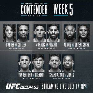 Zojuist vond in The Ultimate Fighter Gym het vijfde evenement plaats van het tweede seizoen van de serie ”Dana White’s Tuesday Night Contender Series”. Tijdens deze wekelijkse evenementen vinden vijf officiële gevechten plaats tussen vechters die strijden voor een UFC contract. Winst is geen garantie voor een UFC contract. Dana White kiest meteen na afloop van de gevechten welke vechter of vechters een contract krijgen. Alle vijf gevechten duren maximaal 3×5 minuten. Tijdens het Main Event nam de ongeslagen Maycee Barber het op tegen DWTNCS Seizoen 1 veterane Jamie Colleen.