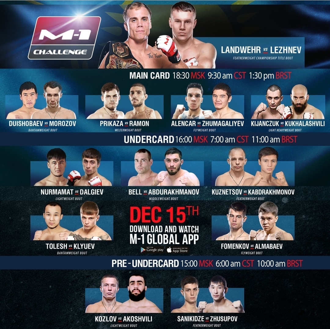 Zojuist vond in Atyrau, Kazachstan het 100ste evenement plaats van de M-1 Global organisatie genaamd M-1 Challenge 100. Tijdens het Main Event zette Featherweight Kampioen Nate Landwehr zijn titel op het spel tegen Andrey Lezhnev. Eveneens maakte bekende namen als Giga Kukhalashvili, Sergey Klyuev, Khamzat Dalgiev en Danila Prikaza onder meer hun opwachting tijdens dit evenement.
