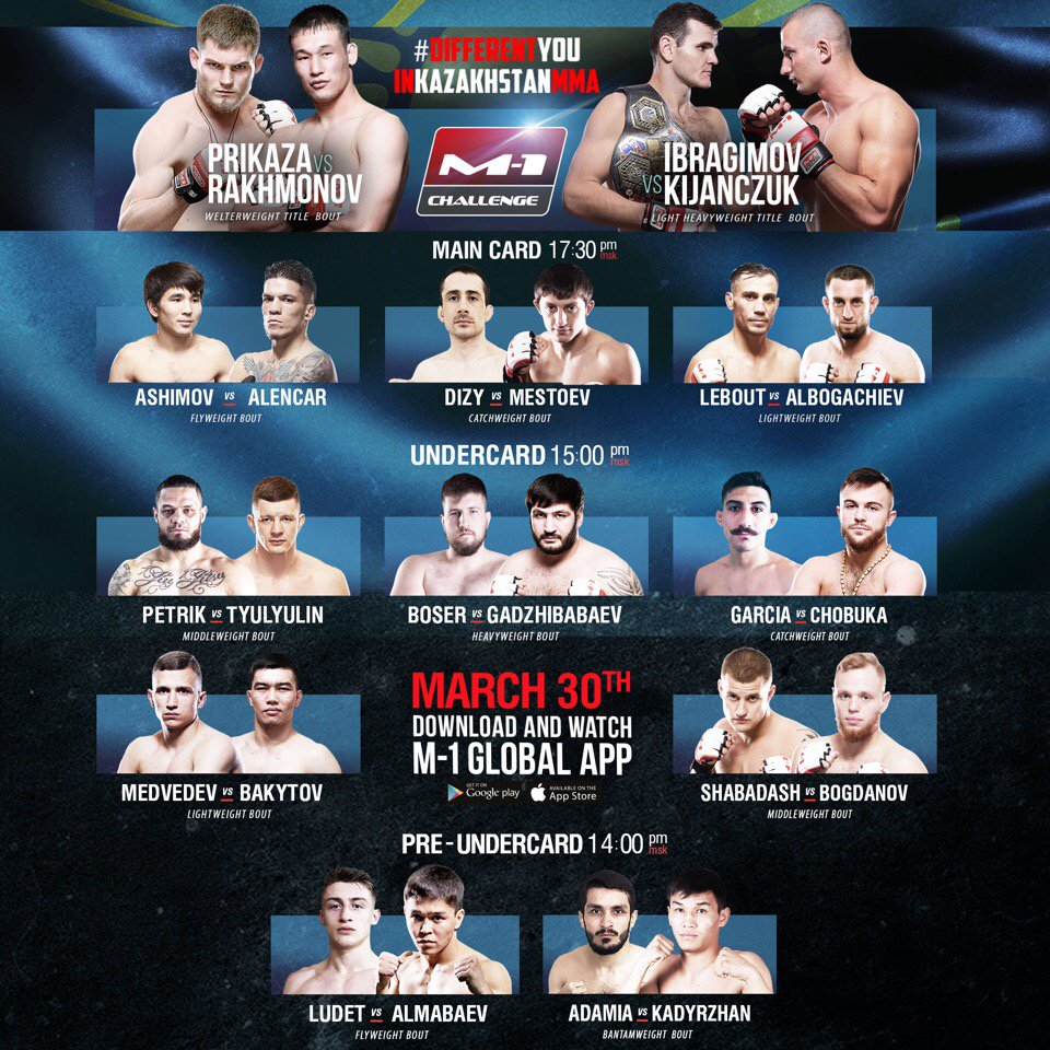 Zojuist vond in de Halyk Arena te Almaty, Kazachstan het M-1 Global evenement genaamd M-1 Challenge 101 plaats. Tijdens het Main Event werd gevochten om de vacante Welterweight titel. Daniil Prikaza nam het op tegen Shavkat Rakhmonov. Eveneens zette tijdens het Co-Main Event Light-Heavyweight Kampioen Khadis Ibragimov zijn titel op het spel tegen Rafal Kijanczuk.