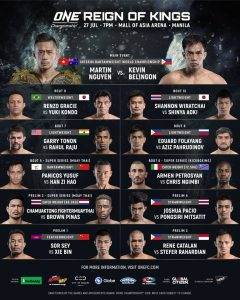 Zojuist vond in de Mall of Asia Arena te Manilla, Filipijnen het 77ste evenement van de ONE Championship organisatie plaats. Tijdens het Main Event nam Lightweight en Featherweight Kampioen Martin Nguyen het op tegen Kevin Belingon voor de Interim Bantamweight titel. Eveneens stond op het Co-Main Event een sterke partij op het programma tussen Shannon Wiratchai en Shinya Aoki. Tot slot maakte ook voormalig Kampioen Eduard Folayang en de legendarische Renzo Gracie beiden hun opwachting.