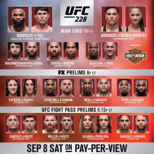 Zojuist vond in het American Airlines Center te Dallas, Texas het UFC 228 evenement plaats. Tijdens het Main Event zette Welterweight Kampioen Tyron Woodley zijn titel op het spel tegen de ongeslagen Engelsman Darren Till. Eveneens stond er een onofficiële #1 contenderfight tijdens het Co-Main Event op het programma tussen Jessica Andrade en Karolina Kowalkiewicz in de Strawweight divisie. Voor de rest maakten onder meer namen als Zabit Magomedsharipov, Jimmie Rivera, John Dodson, Aljamain Sterling en voormalig Kampioene Carla Esparza ook hun opwachting.